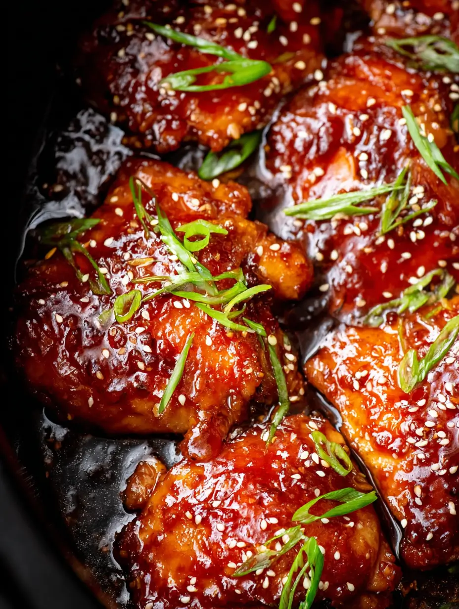 Once cooked, shred the chicken in the sauce using two forks or serve the whole pieces. Garnish with chopped green onions and sesame seeds for added flavor and presentation.