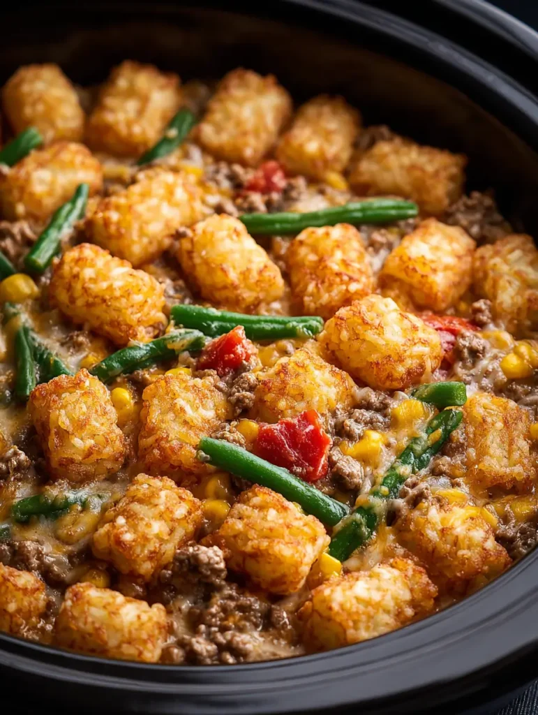- Cover and cook on low for 6-8 hours or on high for 3-4 hours until the tater tots are crispy and golden brown.